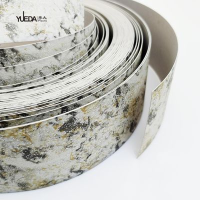 De A0155 kantenband heeft een marmerachtige textuureffect, met een witte basiskleur bezaaid met grijze vlekken van verschillende tinten en afgewisseld met delicate gouden aderen. De unieke stijl straalt artistieke en natuurlijke charme uit, alsof de texturen van natuursteen op ingenieuze wijze op de band zijn gerepliceerd, wat een onderscheidende decoratieve touch toevoegt aan meubels en meer.